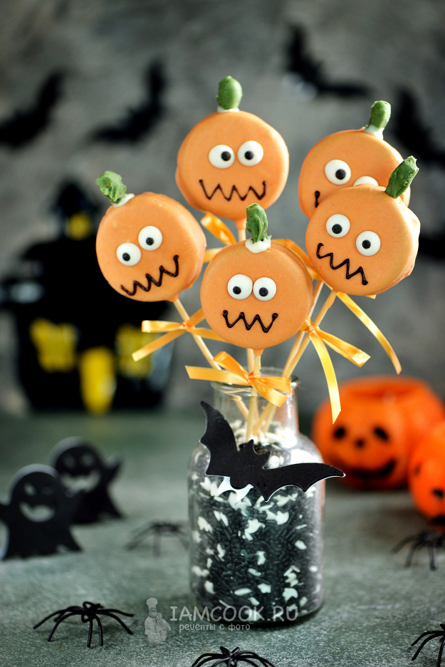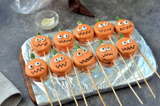 Полейте слегка остывшим шоколадом каждое печенье на палочке, приклейте глаза, также отправьте в холодильник, шоколад должен хорошо застыть. Дальше растопите черный шоколад, нарисуйте ротики тыквам, приклейте сверху оставшимся шоколадом зеленые плодоножки и опять отправьте в холодильник.