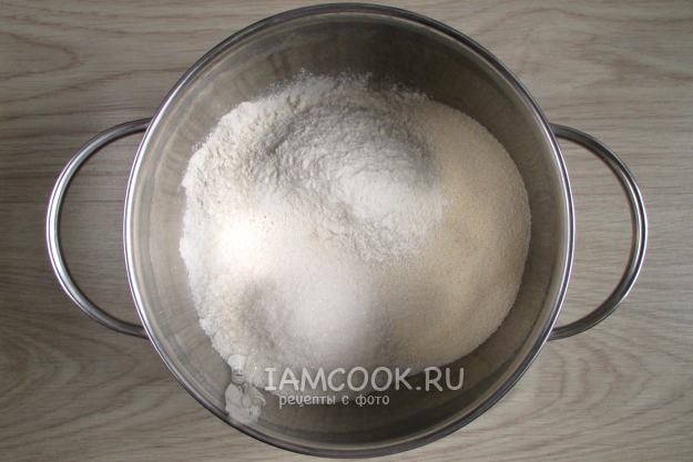 Соедините муку, манку, разрыхлитель и сахар. Перемешайте.