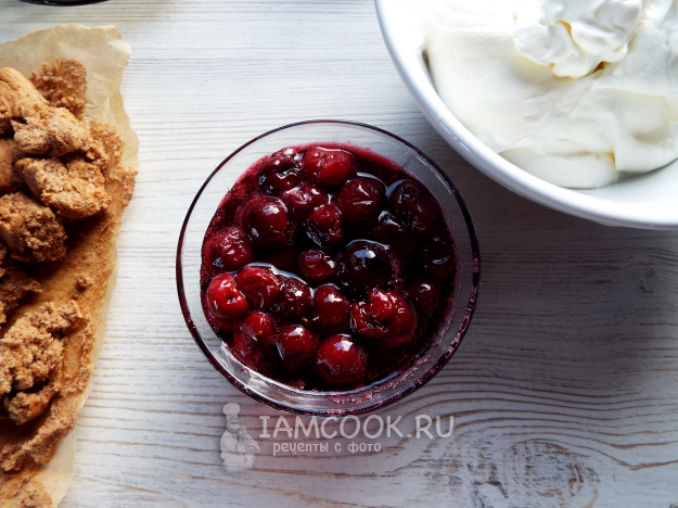 Вишню (вместе с соком) с сахаром проварить в течение минуты, чтобы сахар растворился. Оставить остывать.