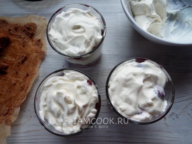 Собрать десерт в стаканчиках или фужерах, выкладывая три компонента поочередно.