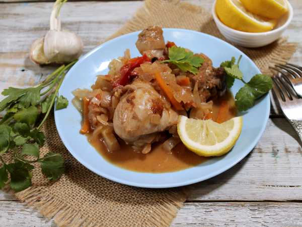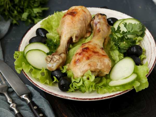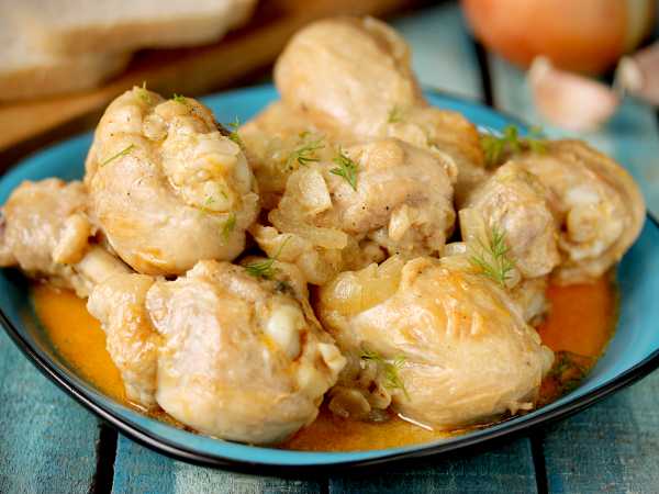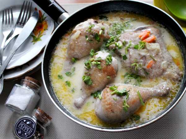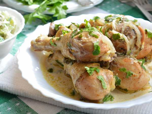 Тушите куриные ножки с подливкой на сковороде 20-25 на медленном огне, добавьте лавровый лист и томите блюдо еще 5 минут. Подлива станет умеренно густой и очень ароматной. Мясо курицы будет мягким, нежным и сочным.