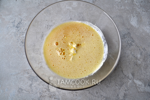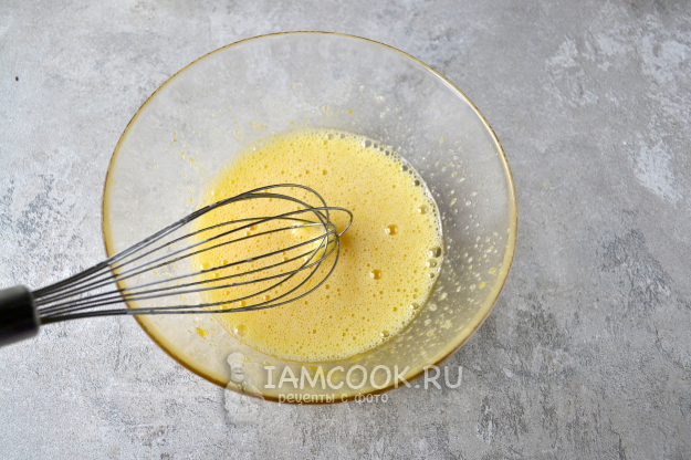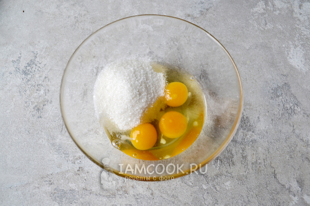 Когда манка набухнет, влейте к ней взбитые с сахаром яйца.