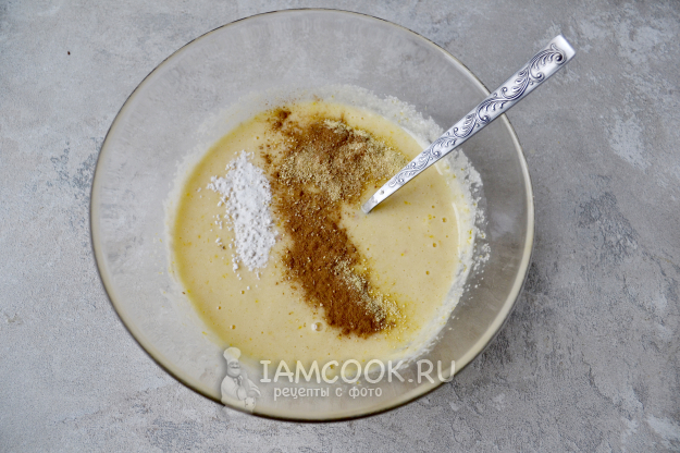 Перемешайте тесто до однородного состояния и всыпьте разрыхлитель, имбирь, корицу и лимонную цедру.