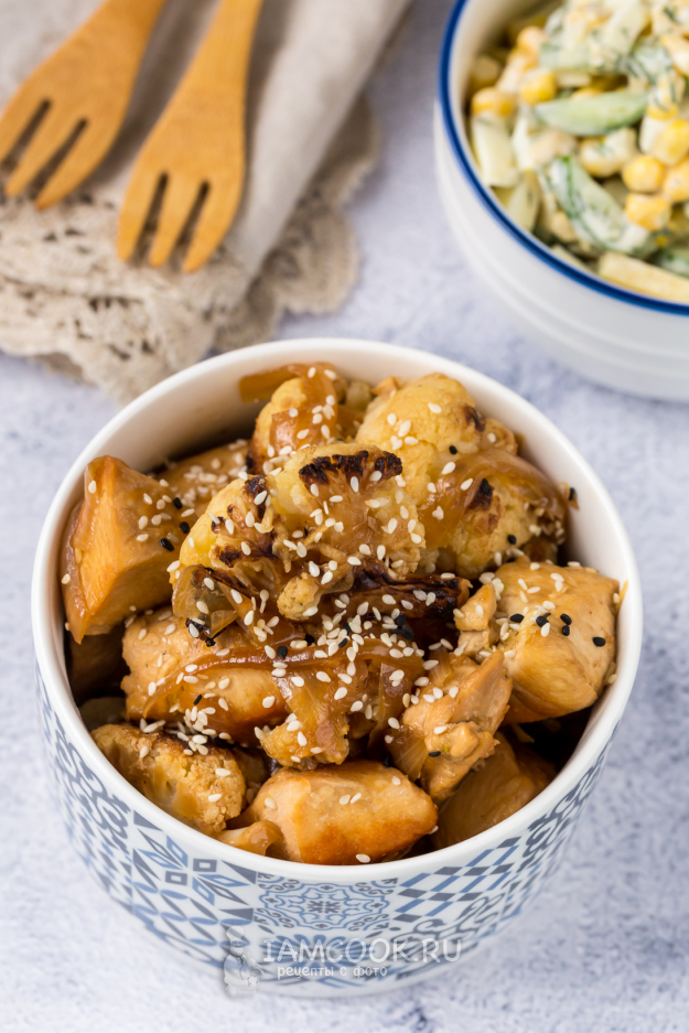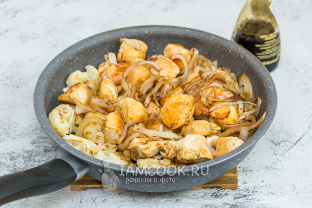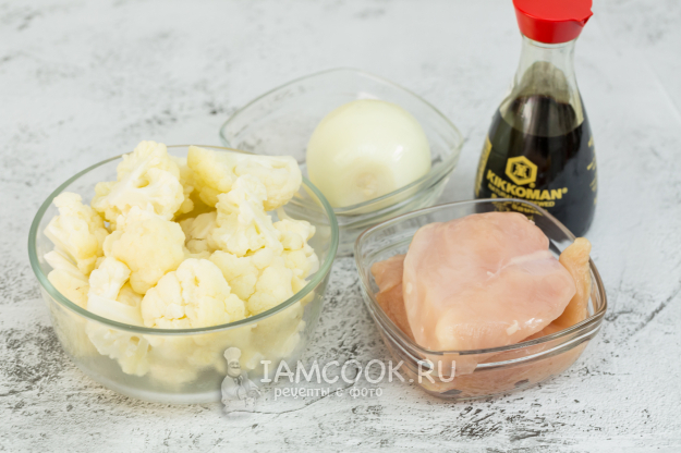 Для приготовления жареной цветной капусты с курицей подготовьте продукты по списку.