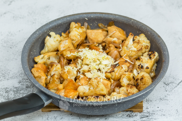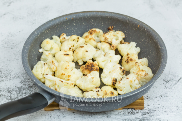 В эту же сковороду выложите цветную капусту. Нагрев - тот же.