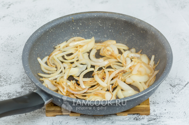 В этой же сковороде обжарьте, помешивая, нарезанный перьями лук. Нагрев - сильный.
