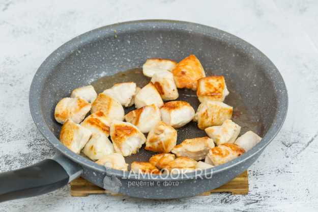 Подсолнечное масло раскалите, и обжарьте на сильном нагреве куриное мясо, нарезанное на удобные для вас кусочки, до образования корочки.