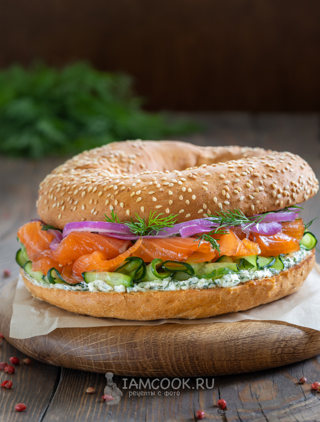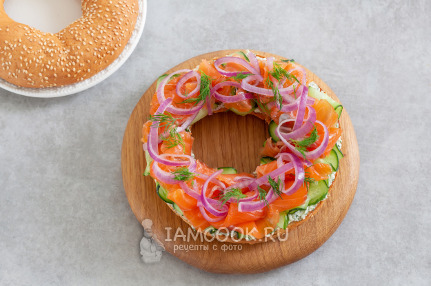 Накройте начинку второй половинкой булочки и подавайте бейглы к столу. Верхнюю половинку бейглов можно предварительно тоже смазать сливочным сыром.