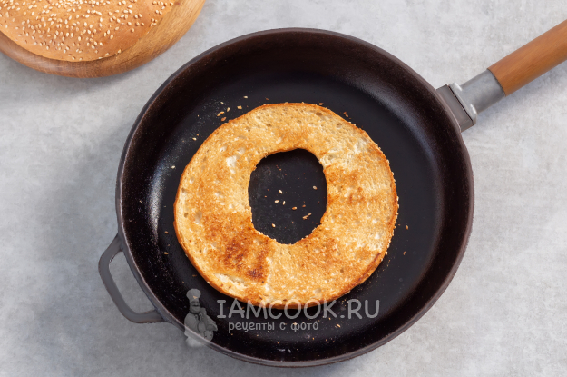 Бейглы разрежьте вдоль. Нижняя часть (основание бутерброда) может быть чуть толще, чем верхушка. Уложите бейглы (верхнюю и нижнюю половинку) срезом вниз на сухую сковороду и прогрейте на среднем огне примерно по 3 минуты, чтобы булочки прогрелись, а верхний слой мякиша аппетитно подрумянился и стал чуть хрустящим. При необходимости обжаривайте половинки бейглов поочередно.