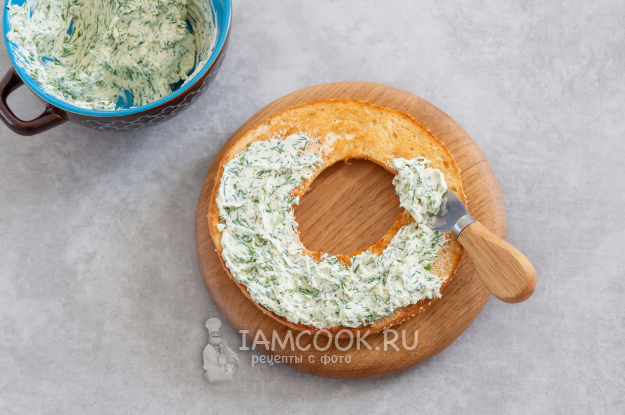 Смажьте нижнюю часть поджаренных бейглов сливочным сыром с зеленью.