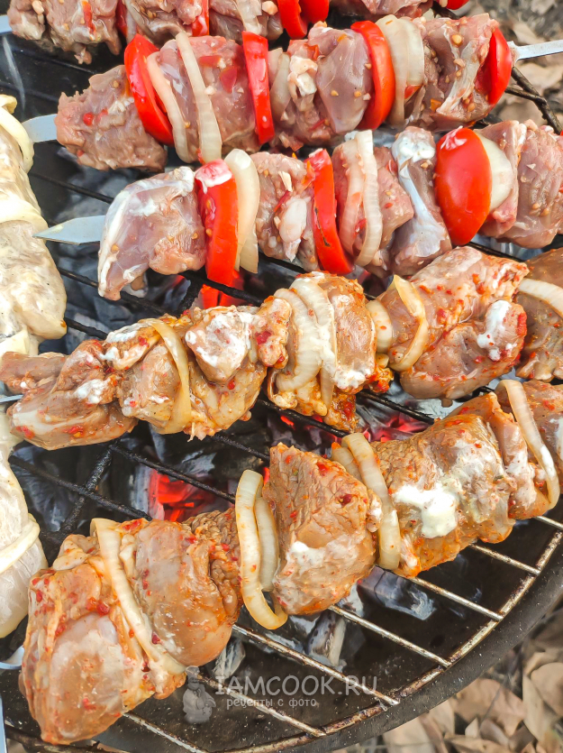 Раскалите угли в мангале и выложите шампуры с мясом. Обжарьте примерно 15-20 минут, в зависимости от жара и величины мясных кусочков. Если они уже отлично подрумянятся сверху, то подрежьте самый крупный из них ножом до шампура. В разрезе должен проступать светлый мясной сок, а не кровь. Если так и происходит, то ваш шашлык полностью готов!