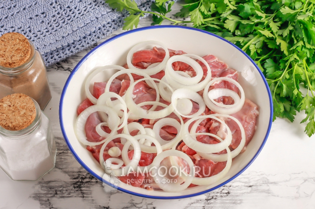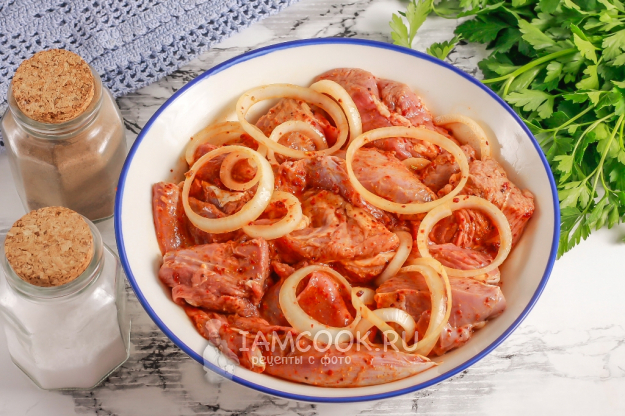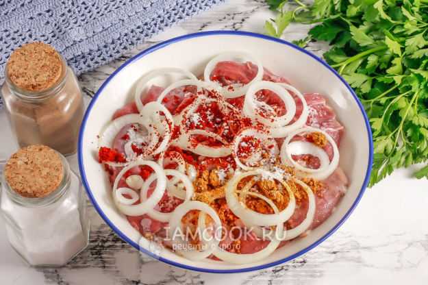 Тщательно перемешайте, чтобы луковая нарезка выделила свой сок. Оставьте шашлык в маринаде минимум на 1,5-2 часа при комнатной температуре.