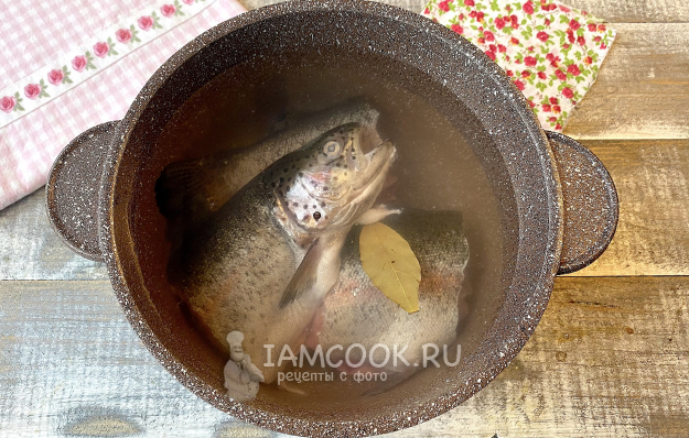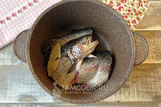 Рыбу очистите от чешуи, удалите жабры, вспорите брюшко и выпотрошите. Промойте под проточной водой и нарежьте на крупные куски. Выложите в кастрюлю, добавьте лавровый лист и перец горошком.