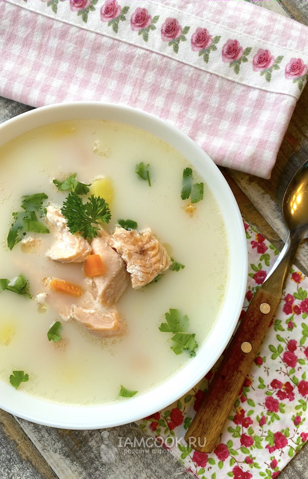 Добавьте свежей зелени и молотый перец, доведите до кипения. Уха из форели со сливочным сыром готова, можно подавать на стол.