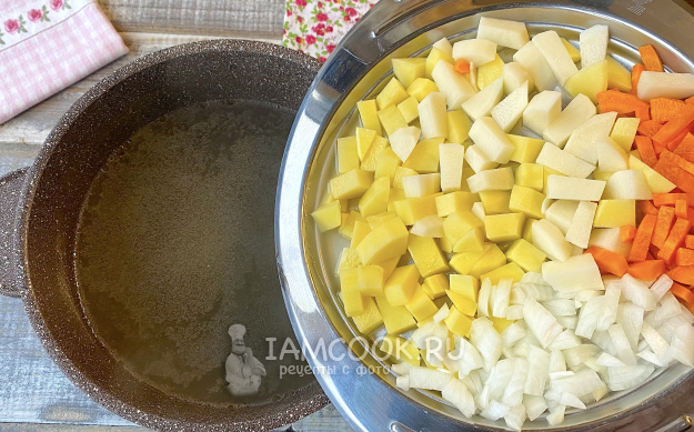 Картофель, морковь и лук очистите и нарежьте на кусочки. Выложите овощи в бульон и варите на умеренном огне до готовности, приблизительно минут 20. Время зависит от размера нарезанных овощей.