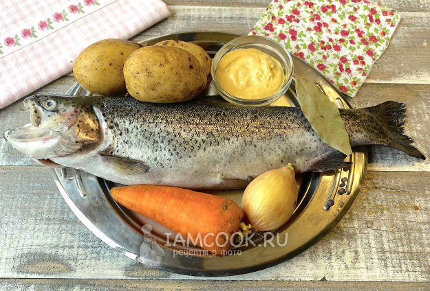 Первым делом подготовьте все необходимые продукты для ухи из форели со сливочным сыром.