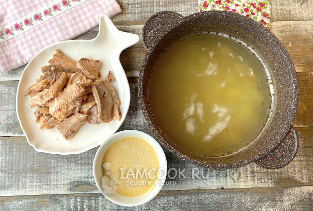 Отделите мясо рыбы от кожи и костей и выложите в бульон. В сливочный сыр влейте немного рыбного бульона и размешайте венчиком до однородной массы, затем влейте в уху.