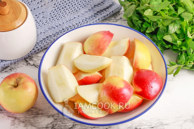 Яблоки допустимо использовать любого сорта. Если они кисловатые на вкус, то просто увеличьте количество сахара и не добавляйте лимонный сок. Яблоки тщательно промойте в воде, разрежьте на четвертинки. Срежьте с них семенные блоки и еще раз промойте.