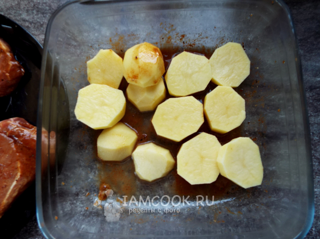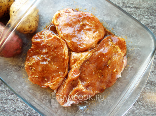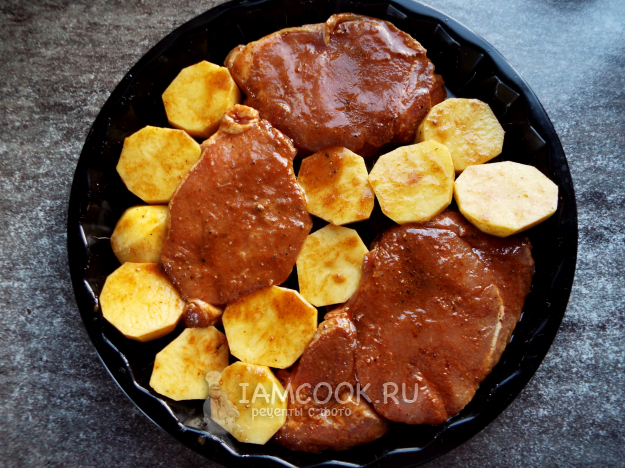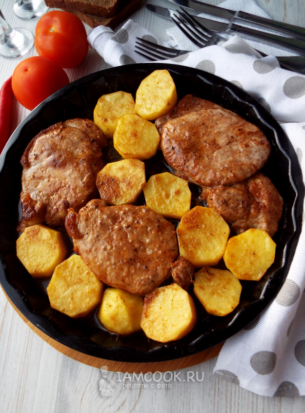 Эскалоп в привычном варианте обжаривается без панировки на масле. В этом же рецепте я предварительно замариновала мясо и зажарила его вместе с картофелем в духовке. Получилось очень вкусно и питательно!