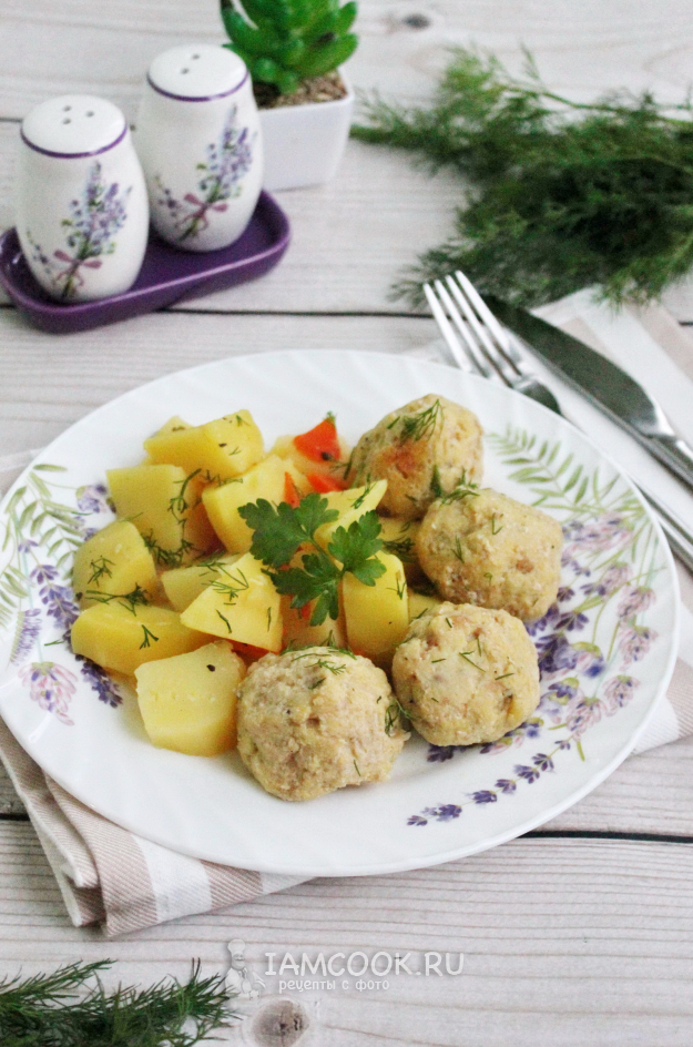 Можно приготовить гарнир для тефтелей в бульоне, в котором они варились. Для этого выложите все тефтели на тарелку, а бульон процедите, удаляя морковь и свеклу. В бульон добавьте немного воды, выложите нарезанный картофель и варите до мягкости. Получается такая своеобразная рыбная картошка.