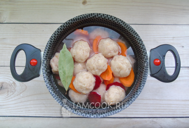 Залейте тефтели водой. Добавьте в воду соль и молотый перец по вкусу.