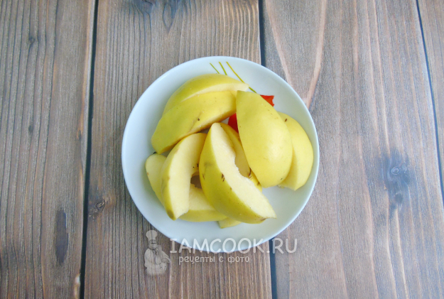 Айву помойте, убирая пушок с её поверхности. Удалите сердцевину айвы с семенами. Нарежьте произвольно. Я нарезала дольками.