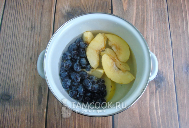 Выложите виноград и айву в кастрюлю, добавьте сахар по вкусу и залейте водой. Поставьте кастрюлю на плиту и варите компот 12-15 минут с момента закипания.