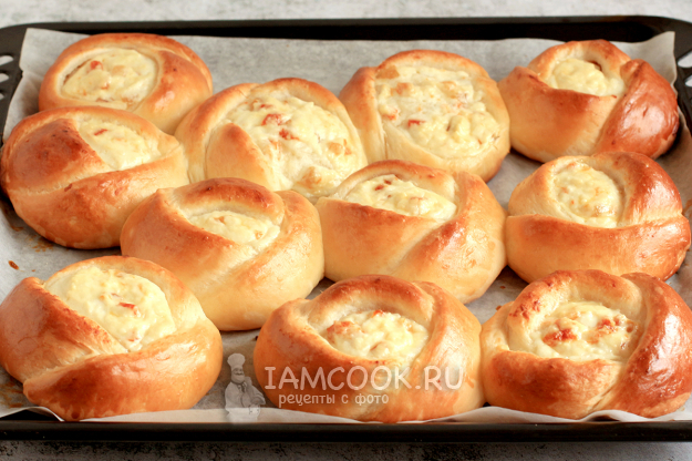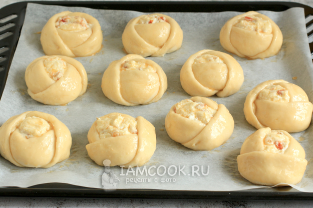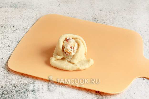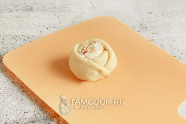 Каждой частью теста по очереди оберните творожную начинку, формируя розочку, при этом концы спрячьте под низ.