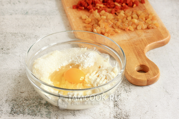 Тем временем подготовьте начинку. Смешайте творог, ванилин, сахар. Затем добавьте изюм и цукаты. Сахар в начинку добавляйте по вкусу, так как творог бывает разный.