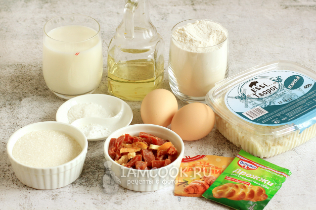 Для ватрушек с творогом и изюмом подготовьте все продукты по списку ингредиентов.