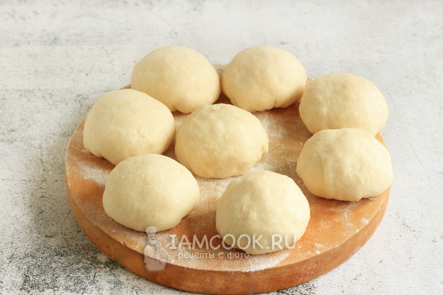 Тесто подошло два раза. Разделите его на одинаковые кусочки не более 60 граммов каждый. Дайте им постоять под полотенцем минут 10-15, чтобы тесто расслабилось, стало послушным и не стягивалось при раскатке.