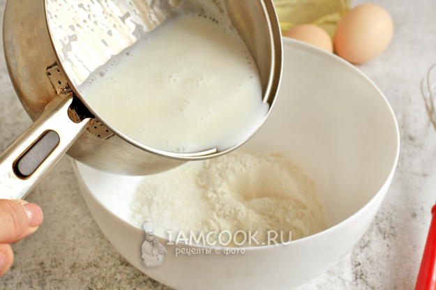 Для заварной основы смешайте в миске муку, сахар, соль и залейте все только вскипевшим молоком. Интенсивно размешивая, доведите полученную субстанцию до гладкости.