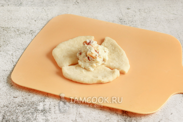 Каждый шарик теста раскатайте в круг, сделайте три надреза, как показано на фото. В центр поместите творожную начинку.