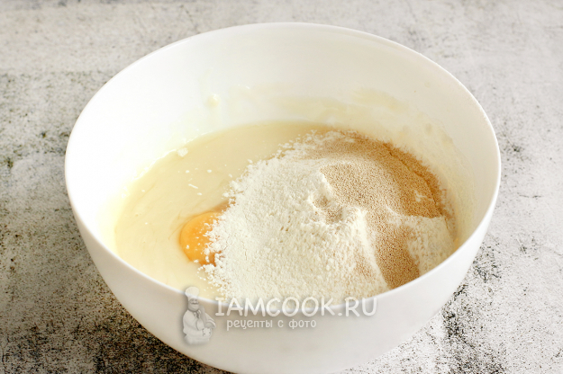 Добавьте остальные составляющие для теста. Дрожжи соедините с мукой. Сразу всю муку не добавляйте, смотрите по консистенции теста, регулируйте густоту.