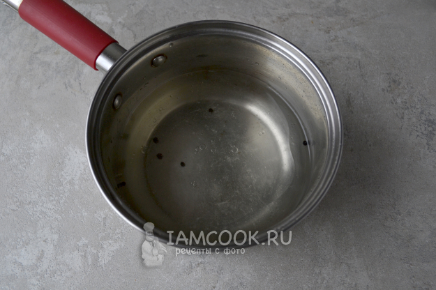 Для маринада насыпьте сахар и соль в сотейник, добавьте несколько горошин черного перца. Влейте воду и поставьте сотейник на огонь.