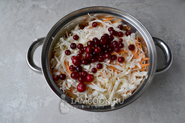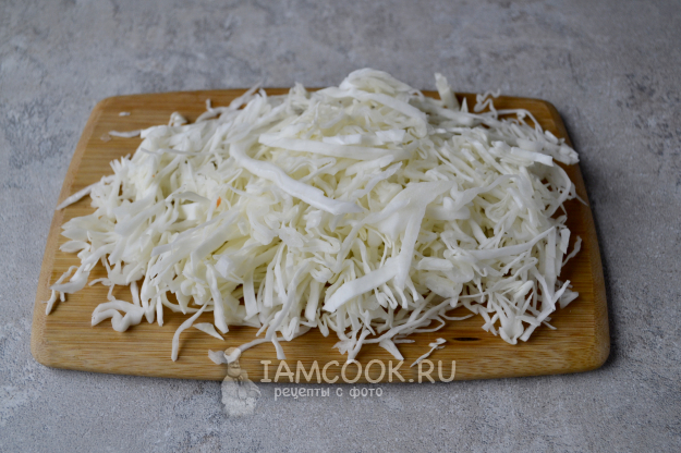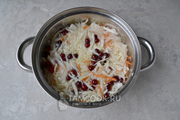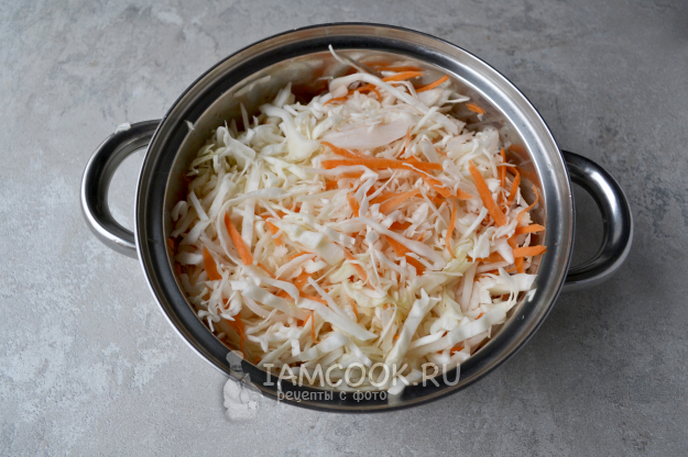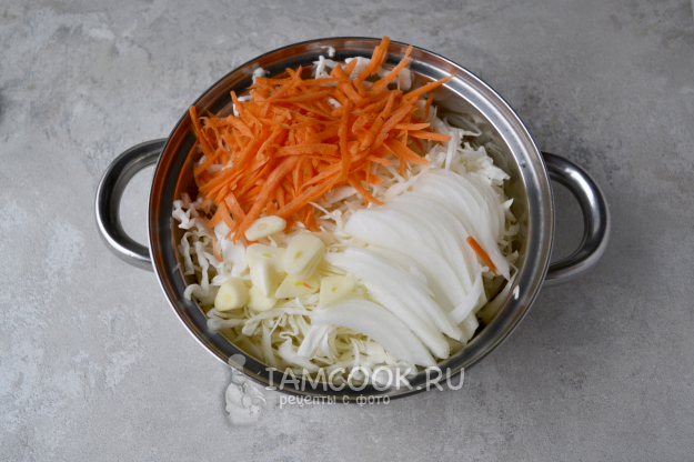 В кастрюлю положите капусту, лук, чеснок, морковь.