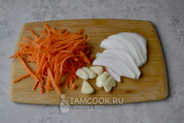 Морковь натрите на крупной терке, лук нарежьте перьями, чеснок - слайсами.