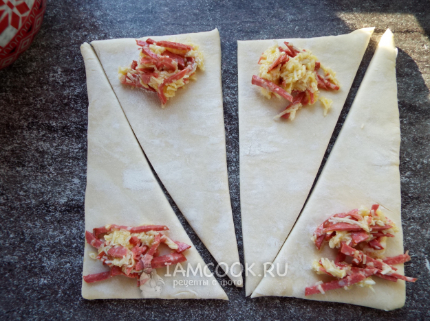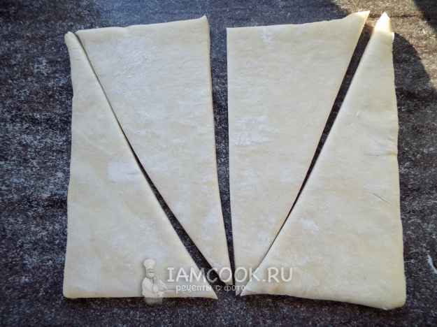 Пласт теста, не раскатывая, разрезать пополам и каждую половину - на треугольники.