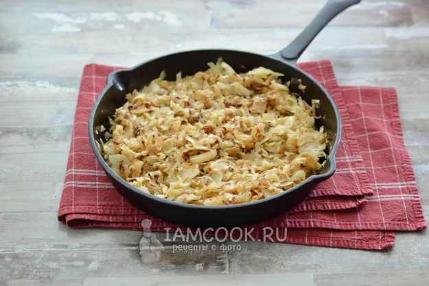 Нашинкуйте капусту и поджарьте её на хорошо разогретом сливочном масле. Жарьте на сильном огне, без крышки, чтобы капуста прям поджарилась и стала слегка коричневатой. Солите по вкусу в конце. Остудите начинку полностью.