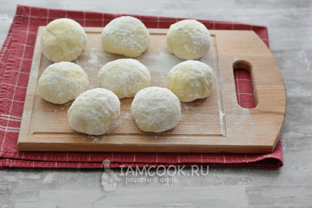 Готовое выбродившее тесто финальный раз вымесите на подпыленной мукой рабочей поверхности, после чего разделите на кусочки по 40-50 г. Каждый кусочек теста скатайте в шарик. Накройте шарики влажным полотенцем или плёнкой и оставьте на 10 минут. Так вам будет удобнее формовать пирожки.