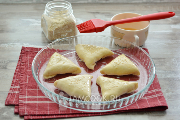 Донышко пирожка обмакните в муку и уложите на противень или в форму для запекания швом вниз и оставьте для расстойки на 15-20 минут. Перед выпечкой смажьте взбитым яйцом и посыпьте слегка кунжутом (для красоты).