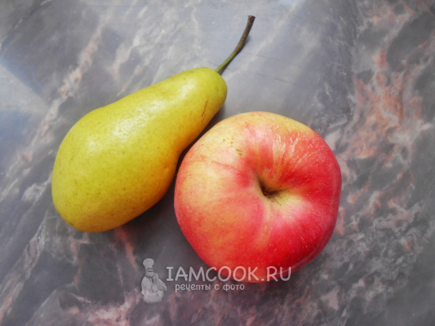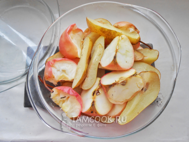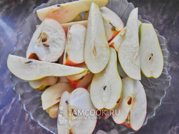 Помойте груши и яблоки, просушите и порежьте на четыре части.