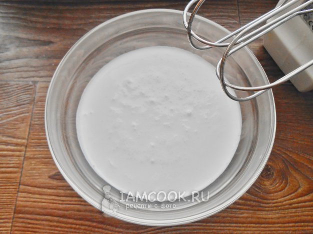 Взбивайте сливки миксером в течение 5-7 минут, до пышности, постепенно добавляя сахарную пудру.