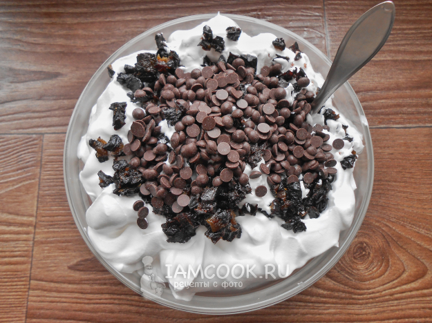 Добавьте во взбитые сливки измельчённые шоколад и чернослив. Перемешайте ложкой.