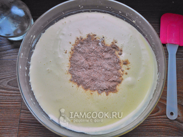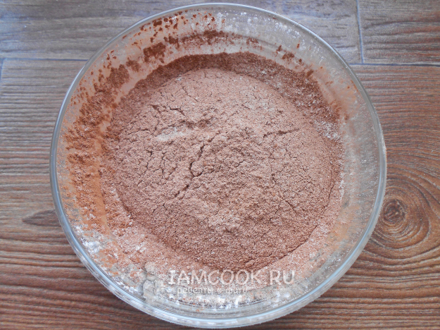 Смешайте пшеничную муку с какао-порошком, разрыхлителем и просейте два раза через мелкое сито. Это делается для воздушности теста и нежности бисквита.