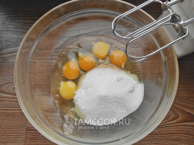 Взбейте миксером яйца с сахарным песком до пышности. Сначала взбивайте на маленьких оборотах одну минуту. Затем продолжайте взбивать 8-10 минут, постепенно увеличивая скорость.