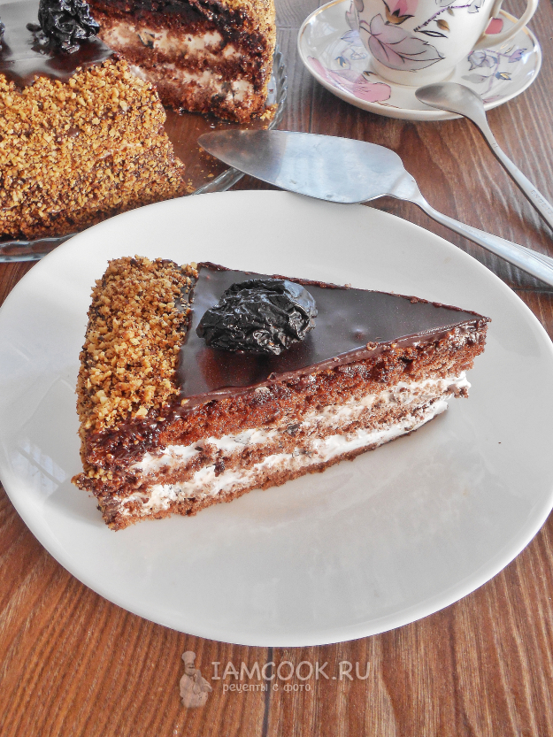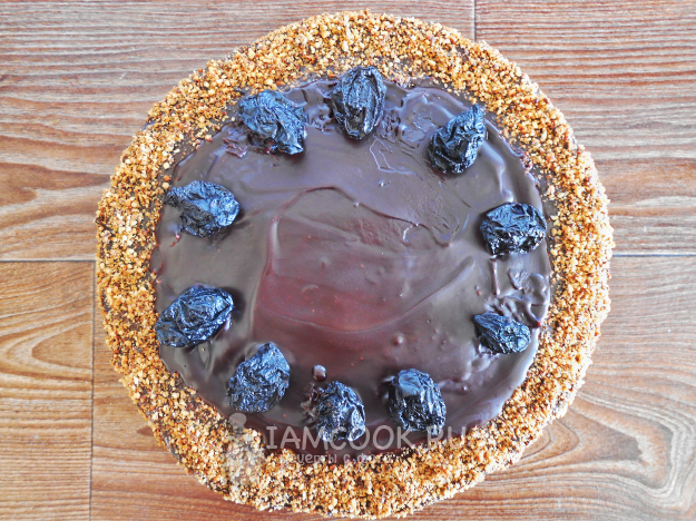 Украсьте сверху торт измельчёнными грецкими орехами и целым черносливом, как на фото или по желанию.
