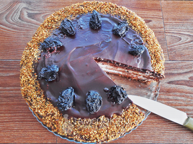 Торт «Чернослив в шоколаде» не нуждается в пропитывании, поэтому его сразу можно нарезать. Режьте торт теплым ножом, чтобы глазурь не потрескалась.
