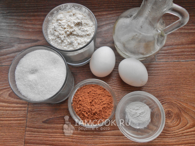 Подготовьте необходимые продукты для торта «Чернослив в шоколаде». Начнём с шоколадного бисквита. Яйца тщательно вымойте. Растительное масло берите без запаха.