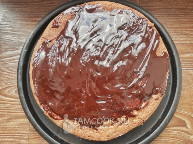 Смажьте верхний корж торта горячей шоколадной глазурью, равномерно ее распределяя.
